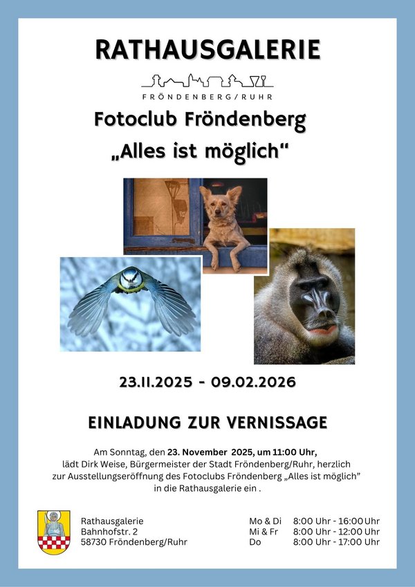 Die Rathausgalerie Fröndenberg eröffnet am 23.11.2025 die neue Ausstellung des Fotoclubs Fröndenberg „Alles ist möglich“. Zur Vernissage lädt Bürgermeister Dirk Weise herzlich ein. Beginn ist um 11:00 Uhr im Rathaus der Stadt Fröndenberg/Ruhr, der Eintritt ist frei.