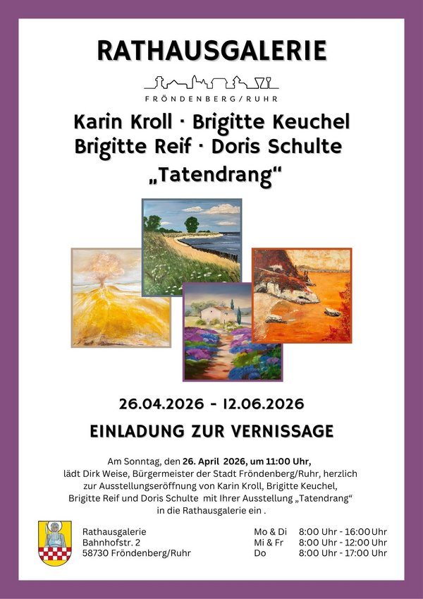 Die Vernissage findet am Sonntag, den 26. April 2026, um 11:00 Uhr in der Rathausgalerie, Bahnhofstraße 2, 58730 Fröndenberg/Ruhr, statt. Die Besucherinnen und Besucher sind eingeladen, die facettenreichen Werke von den vier Künstlerinnen zu entdecken. Die Künstlerinen freuen sich darauf, ihre Arbeiten zu präsentieren und mit Kunstinteressierten ins Gespräch zu kommen.