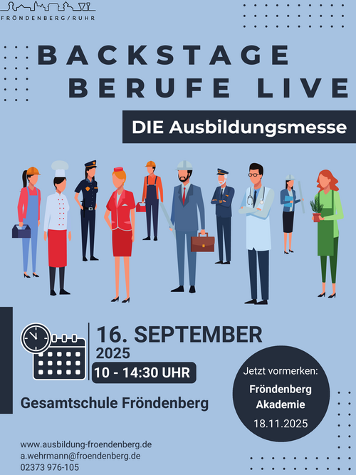 SAVE THE DATE für die „FröndenbergAkademie“ am 18. November 19 - 21 Uhr, ebenfalls in der Gesamtschule Fröndenberg (GSF): Sechs Ausbildungsbetrieben wird die Möglichkeit geboten, sich und die Ausbildungsmöglichkeiten den Erziehungsberechtigten und Jugendlichen zu präsentieren.