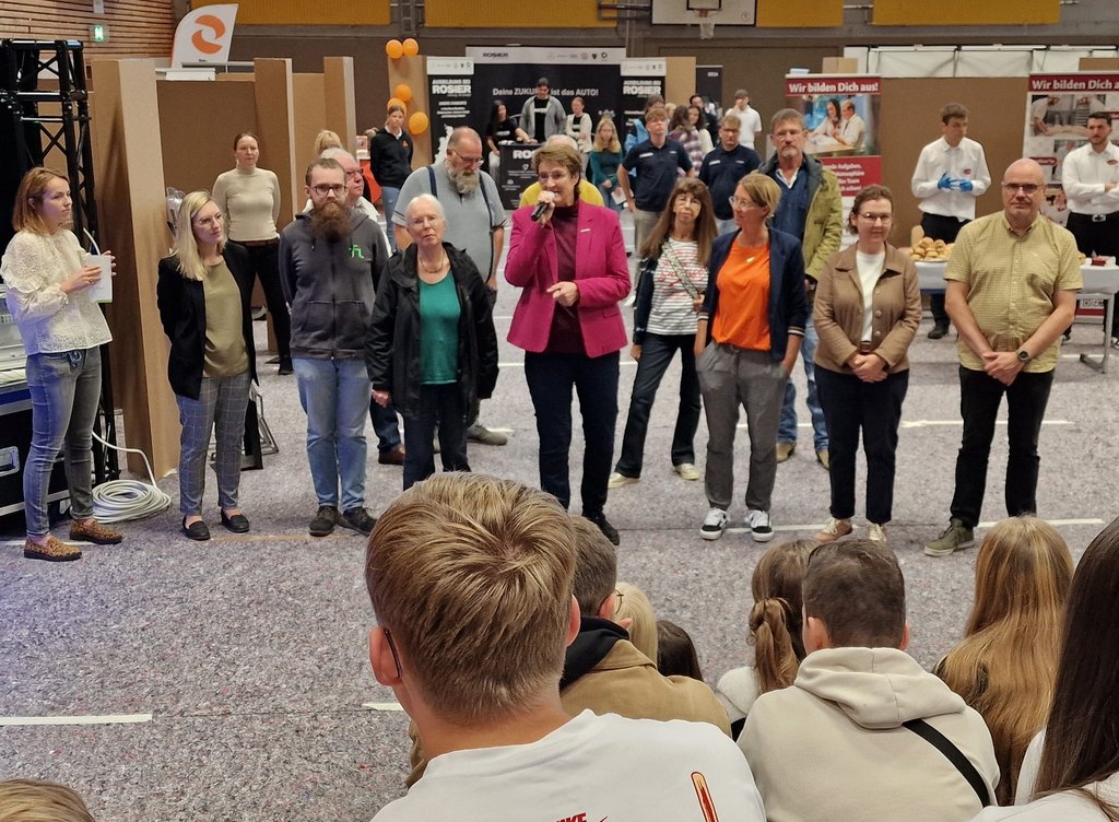 Schulleiterin Verena Verspohl ergänzte: „Wir sind der Stadt sehr dankbar, dass sie die Ausbildungsbetriebe in unsere Schule und damit direkt zu den Schülerinnen und Schülern bringt! Bürgermeisterin Müller hat sich von Anfang an für eine enge Zusammenarbeit mit uns und für einen erfolgreichen Übergang von der Schule in den Beruf stark gemacht! Im Unterricht bereiten wir die Schülerinnen und Schüler sorgfältig auf die Begegnung mit der Arbeitswelt vor. Die Zahlen zeigen, dass wir überdurchschnittlich viele Ausbildungsplätze im 10. Jahrgang verzeichnen. Das ist eine Win-Win-Situation für beide Seiten: für die Jugendlichen und für die Region!“