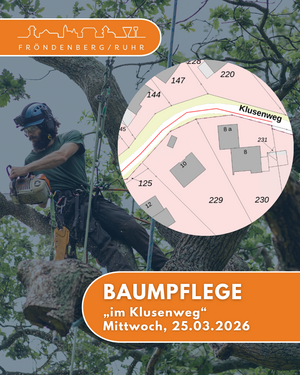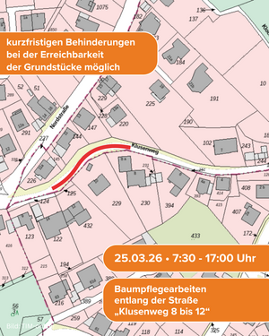Am Mittwoch, den 25.03.2026, in der Zeit von 7:30Uhr Uhr bis 17:00 Uhr werden erforderliche Baumpflegearbeiten entlang des Klusenwegs, zwischen den Häusern Nr. 8 und Haus Nr. 12 durchführen. Während der Arbeiten ist der Klusenweg für den Durchgangsverkehr voll gesperrt.