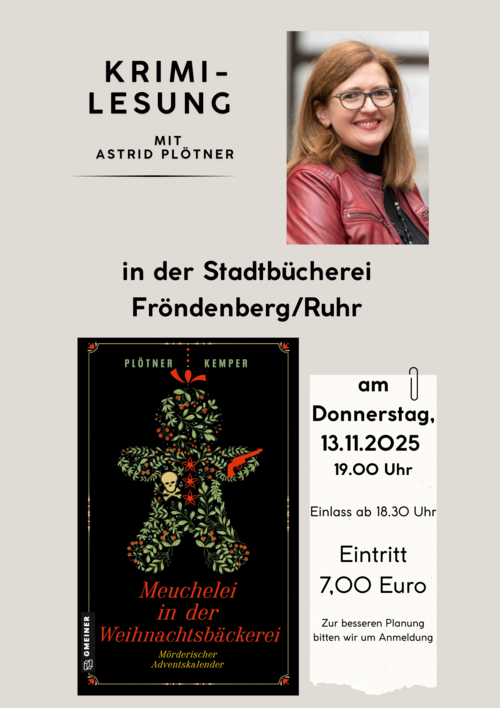 Das Team der Stadtbücherei verspricht einen spannenden vorweihnachtlichen Abend mit dem aktuellen Buch von Astrid Plötner „Meuchelei in der Weihnachtsbäckerei“. Die darin enthaltenen 24 Kurzkrimis sind voller krimineller Energien. Tatorte sind unter anderem das Dortmunder Westfalenstadion, ein Ort am Möhnesee und natürlich auch Fröndenberg. Auf jeden Krimi folgt ein Backrezept – köstlich und völlig ungiftig!