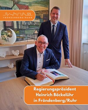 Regierungspräsident Heinrich Böckelühr hat am Donnerstag, 2. April 2026, die Stadt Fröndenberg/Ruhr besucht. Vor Ort hat er sich ein umfassendes Bild von aktuellen Entwicklungen und Projekten gemacht. Bürgermeister Dirk Weise hat den Regierungspräsidenten dazu gemeinsam mit dem Technischen Beigeordneten Claas Henning Wilke empfangen. Um im stetigen Austausch mit den Städten und Gemeinden im Regierungsbezirk Arnsberg zu sein, pflegt der Regierungspräsident dieses Format des Kommunaldialogs.
