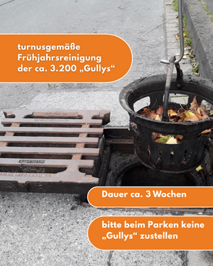 Ab Dienstag, den 07.04.2026, beginnt die turnusgemäße Frühjahrsreinigung der rund 3.200 Straßenabläufe im Stadtgebiet. Diese ca. 3 Wochen dauernde Reinigung der „Gullys“ erfolgt durch einen Dienstleister und erfolgt zweimal jährlich.