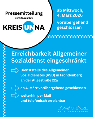 Kreis Unna . Aufgrund umfangreicher Sanierungs- und Umbauarbeiten bleibt die Dienststelle des Allgemeinen Sozialdienstes (ASD) in Fröndenberg/Ruhr an der Alleestraße 22a ab Mittwoch, 4. März vorübergehend geschlossen. Die Mitarbeiterinnen und Mitarbeiter sind jedoch weiterhin per Mail und telefonisch erreichbar.