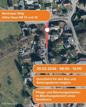 Am Freitag, den 20.03.2026, ist zur Durchführung erforderlicher Pflege- und Räumungsarbeiten im Böschungsbereich eines Gewässers die Sperrung des Bentroprer Weges zwischen den Hausnummer 13 und 14 erforderlich. Die Sperrdauer erstreckt sich auf den Zeitraum zwischen 08:00 Uhr und 12:00 Uhr. Den dort verkehrenden Linienbussen sowie Einsatzfahrzeugen von Rettungsdiensten wird in dieser Zeit die Durchfahrt ermöglicht, die übrigen Verkehrsteilnehmer werden gebeten, den Bereich über die Bausenhagener Straße zu umfahren. Eine gesonderte Umleitungsausschilderung erfolgt nicht.